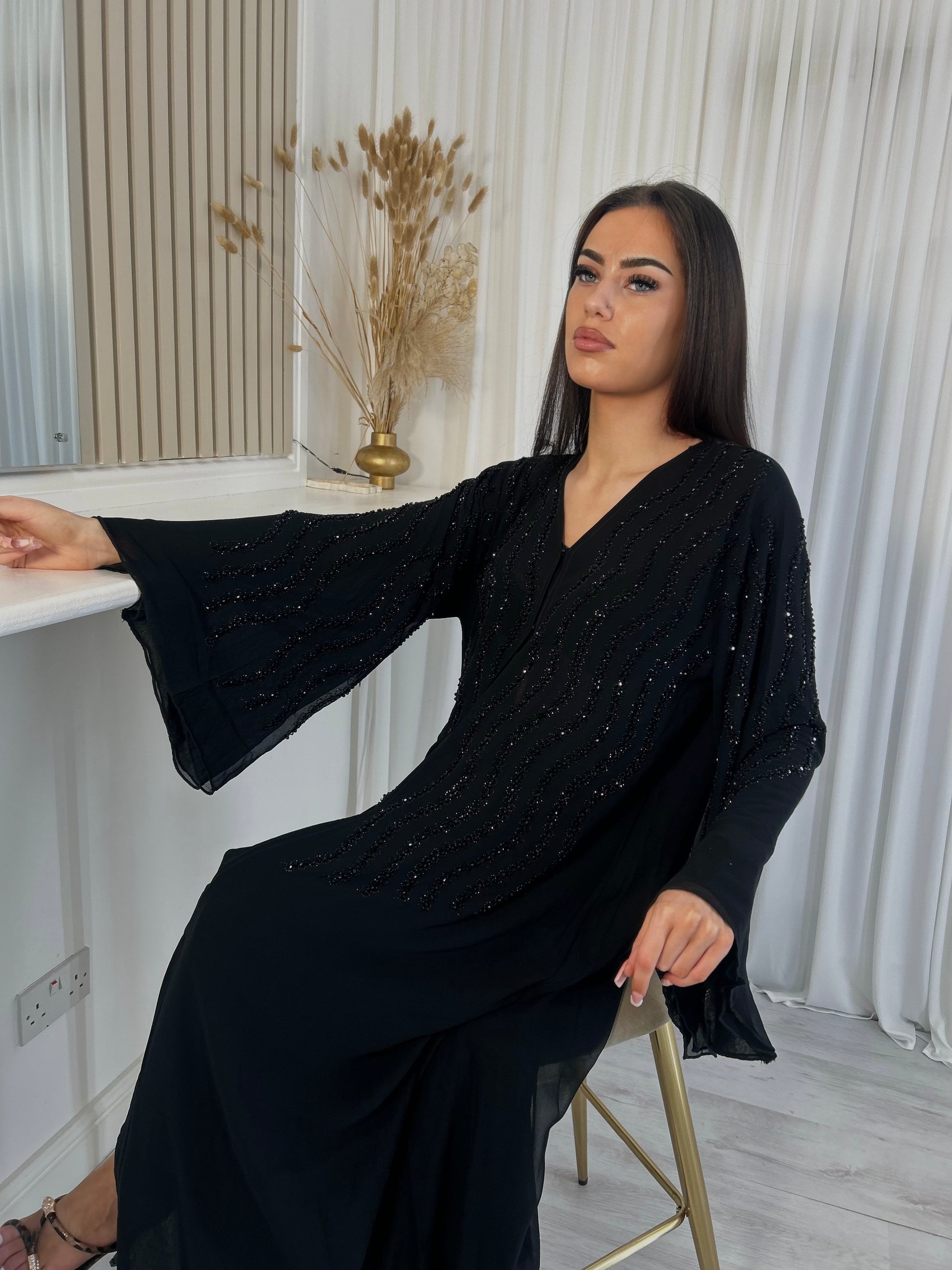 Elevate your wardrobe with this stunning Layali chiffon abaya in Black, a perfect blend of elegance and modern design. The abaya features a lightweight, flowy chiffon overlay that drapes gracefully, making it ideal for both casual outings and special occasions. The abaya is andorned with handsewn bead design, adding a sophisticated texture that enhances the overall look.